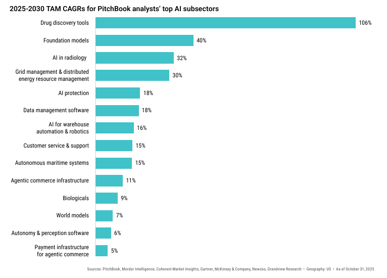 PitchBook highlights several AI subsectors with exceptional growth potential toward 2030: